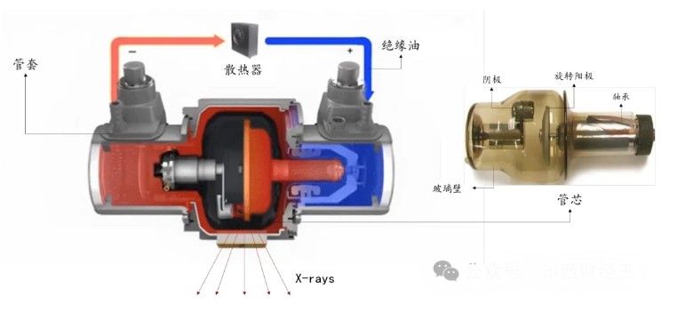 在工作原理上,它的工作原理是通过阴极灯丝发射电子,在高压电场作用下高速撞击阳极靶面,撞击后有1%的能量转换为X射线,而剩余99%的能量则都转化为热能。