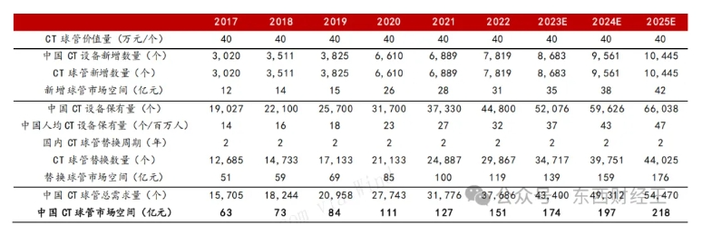 据测算,光是维修和新安装配套这两块市场加起来,在国内CT球管市场规模就已经超200亿元。
