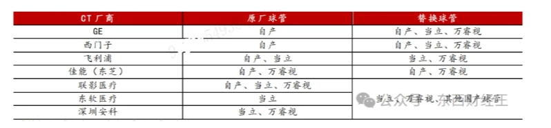 原厂球管主要由GE、西门子、飞利浦等头部CT厂商自产,其他厂商则采用当立和万睿视的OEM球管。