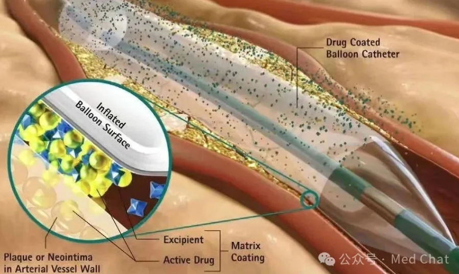 药物球囊扩张导管呢,就是在球囊有效长度的范围上铺设一层药物(主要为紫杉醇或西罗莫司及其衍生物),待球囊导管沿着导丝达到病变位置后,对球囊进行充盈并维持短暂的(血管内的扩张时间通常为30秒-60秒,自然腔道内的使用时间却可相应延长)扩张。在对球囊充盈扩张后,球囊从折叠状态转化为膨胀状态,使得球囊表层的药物贴敷于病变区域,并将药物快速、均匀地释放至对应位置,从而抑制病变区域内膜的过度增生,进而有效预防目标位置的再狭窄,最终达到“介入无植入”的设计理念。