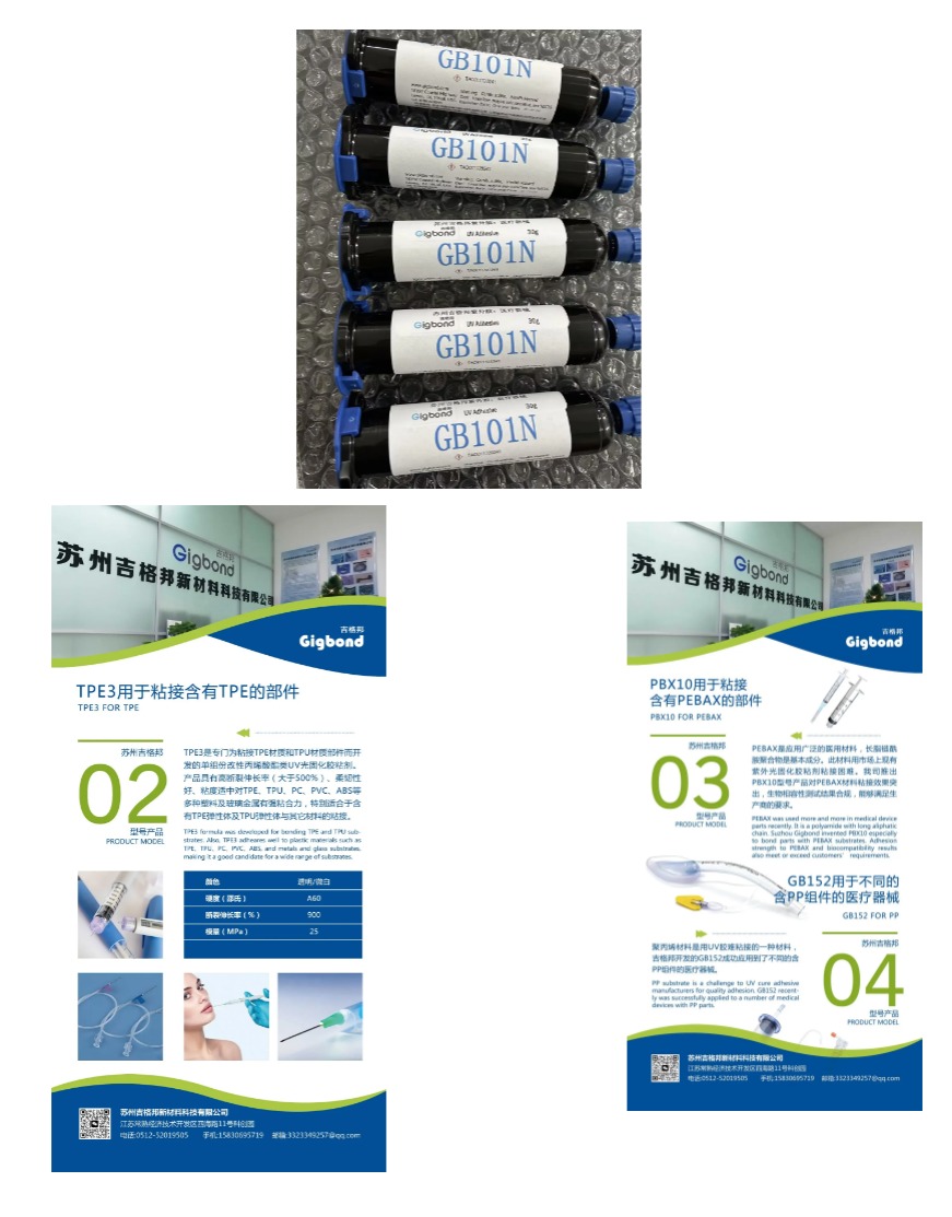 苏州吉格邦新材料科技有限公司是美国Gigbond LLC在中国成立的合资公司,主要从事新材料科技领域内的功能高分子材料,光固化胶粘剂,高固体份、无溶剂涂料,水性油墨,电子束固化紫外光固化等低挥发性油墨及固化设备的研发、销售。 目前公司已推出电子、医用级及光学级的各类胶粘剂,针对不同材料提供相应的粘结方案,其中医用级UV胶水适用于针头、导管、引流管、透析部件、氧气面罩、玻璃、金属、塑料部件粘接。我公司专门针对这类材料提供了最优的固化粘合方案,该系列产品有更好的稳定性以及符合ISO10993生物相容性标准,且便于自动化组装,大幅度提高效率降低成本,受到用户一致好评。