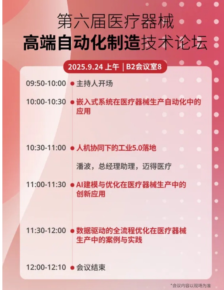 2025Medtec国际医疗器械供应链生态峰会打造生产制造工艺板块 ,其中第六届医疗器械高端自动化制造技术论坛聚焦高精度的生产和控制,以减少人为误差和次品率,从而降低了生产成本,进一步提高医疗器械生产行业的竞争力。