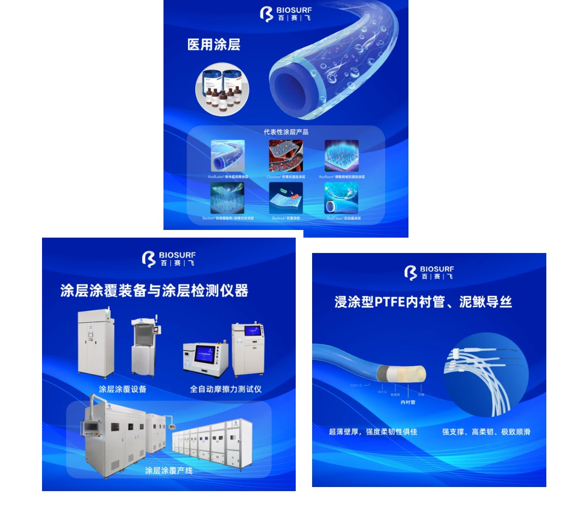 江苏百赛飞生物科技有限公司是生物材料表面改性技术领域的国家“专精特新”小巨人企业,自2017年成立以来,历经多轮融资及扩建,现拥有近25,000平米研发及生产场地,率先创建了涵盖功能涂层全产业链的技术服务平台,包括自主研发的多系列医用涂层产品(亲水润滑、抗凝血、抗菌、抗结晶、释药等七大品类)、自动化涂覆装备/产线、涂层AI质检及分析仪器,是国内拥有医用涂层相关专利最多的企业,主导建立了国内首个介入医械涂层牢固度相关行业标准,并有多项填补国内空白的抗凝血、抗菌等医用涂层相关团体标准发布;建成国内极少数符合危化品与医用品双重规范标准的医用涂层规模化生产基地,已服务全球医械厂家取得数百张NMPA、FDA、CE医疗器械注册证。