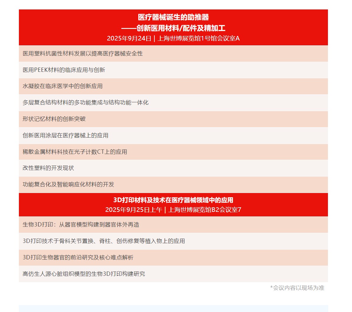 除了丰富的产品展示,主办方还将举办同期Medtec国际医疗器械供应链生态峰会:医疗器械诞生的助推器——创新医用材料/配件及精加工论坛及3D打印材料及技术在医疗器械领域中的应用论坛。届时稀散金属材料科技在光子计数CT上的应用、多层复合结构材料的多功能集成与结构功能一体化、3D打印生物器官的前沿研究及核心难点解析等热门话题将进行分享。