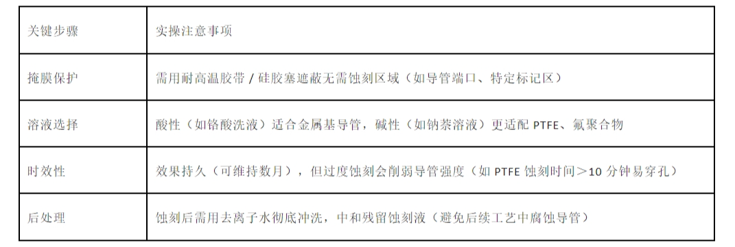 原理:用酸性 / 碱性溶液(如 PTFE 导管常用碱性蚀刻液)腐蚀表面,形成粗糙结构。
