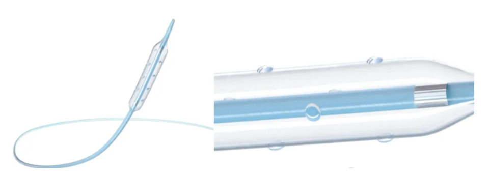 这是刻痕技术的进阶设计。它将三角形或半圆形的镍钛合金绕簧丝直接、牢固地整合在球囊的工作段,绕簧丝在径向有强劲的扩张力,可有效、均匀撕裂血管内膜,获得优异的扩张效果,同时轴向具有较好的柔顺性,可安全通过弯曲血管及分叉处。“一体化”设计旨在保证刻痕件与球囊的整体性,以实现更可控的“定向”切割。