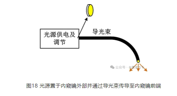 另一种方式则是将光源置于外部,而通过导光束(一般也是由光纤束构成)将光照传导至内窥镜前端,如图18所示: