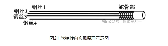 牵引四根钢丝可以使蛇骨部发生上下左右的偏转,从而通过弯曲的腔道或者对不同方向的器官表面进行观察治疗。牵引钢丝使蛇骨部发生偏转通过腔道,类似于操控汽车方向盘进行转弯一样,当蛇骨部通过弯曲腔道后,再释放相应钢丝,则完成了整个转向的操作。蛇骨部后端为软管,随前端运行轨迹运动。