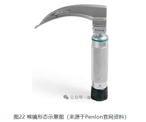 有一类内窥镜形态与常见的硬镜和软镜不同,就是喉镜,其主要用作插管使用。在今年的新冠疫情中,很多人对呼吸机已耳熟能详,而对于有创呼吸机,是需要将通气导管插入人体气管内部,以完成机械通气支持。插管的过程中就需要借助喉镜。喉镜的形态如图22所示: