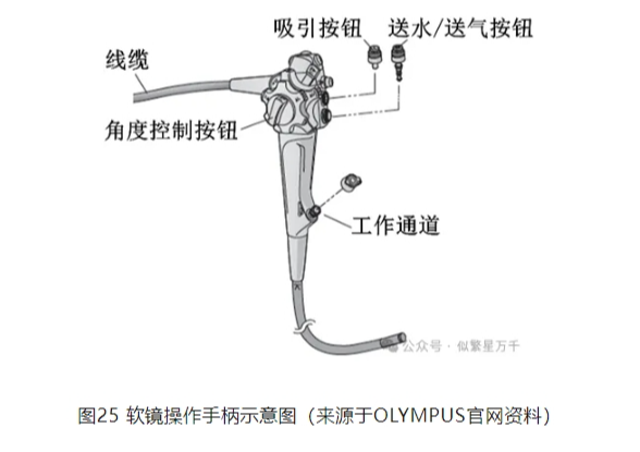 软镜的末端通过手柄对前端运动轨迹及各种通道功能进行操作,如图25所示: