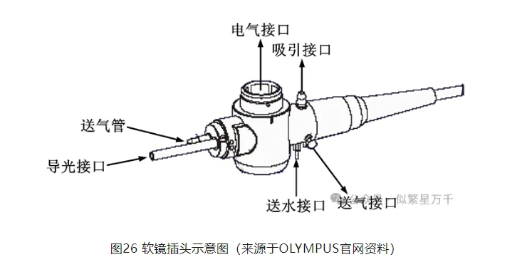 对于图像由光纤束传出的情况,也可以没有电气接口;在一些内窥镜插头处还会有用于测漏灭菌等功能的通气接口和电气安全接口等。