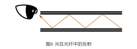 光纤束传导图像的原理是通过光在光纤内部不断反射实现的,如图6所示: