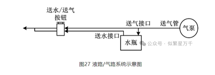 软镜插头各个接头连接不同的外部设备,共同实现内窥镜各种操作功能。比如,导光接口连接光源实现照明提供;电气接口连接图像处理单元实现最终成像;吸引接口连至吸引泵实现吸痰等操作;送气管连接至气泵,送水接口和送气接口连接至水泵共同构成液路/气路系统,如图27所示: