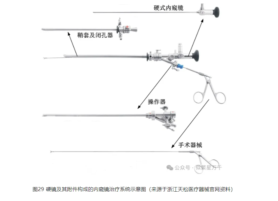 硬镜由于多用在局部、短距离且呈一定角度直线固定位置操作的检查和手术场景中,需要建立人工孔道。与软镜不同之处在于,硬镜往往是仅包含成像通道和照明通道的,而没有其它通道。其它通道需要另行在人体建立孔道介入,或者通过附件形式与硬镜连接,如图29所示:
