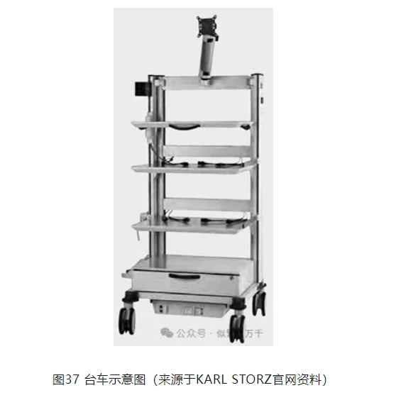 以上内窥镜系统所涉及的设备往往都是置于医用台车上的,其设计除需要考虑与内窥镜系统功能集成相关的结构设计外,还需要考虑抗压、负重、减震、平稳、牢固及滚轮刹车制动等性能。如图37所示为台车示意图: