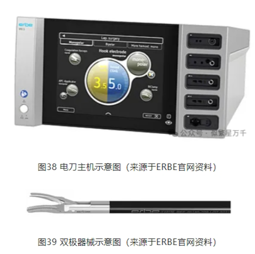 电刀主要用于对组织进行切开和凝血,是通过高频高压电流与机体接触对组织进行加热实现的,分为单极电刀和双极电刀,如图38和图39所示: