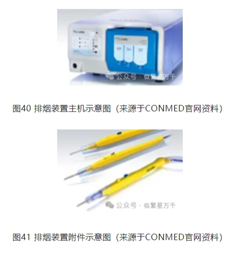 排烟装置用于电刀在对组织进行切开和凝血等操作时,排出所产生的烟雾,以避免烟雾对手术视野产生影响,并且烟雾中一般还含有有害物质。如图40和图41所示分别为排烟装置主机和附件: