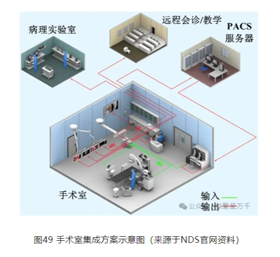 集成及信息化是指按照一定目的将某个区域或多个区域中的部分或全部设备信息进行集成,并在一个或多个设备上进行显示和操作,或者传输至医院信息网络实现流程化管理等。如图49所示为手术室集成示意图: