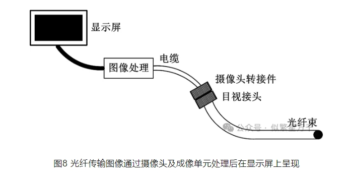 以上是三种基本的观察方式。当然也有其它一些成像方式可以灵活应用,比如在光纤束末端加入一个摄像头和图像处理单元,将光纤束传输的图像呈现在显示屏上,如图8所示: