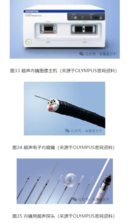 还有一类超声内镜,在内镜中置有微型超声探头,可在内镜下进行超声实时扫描,从内部获得某些组织脏器的超声图像。比如肠胃,受限于气体对超声信号的反射有时是难以从人体外部检查的,而从内部则可以应用超声对一些病灶进行更好的确诊。超声内镜还可以实现穿刺引导等。如图33至图35所示分别为超声内镜图像主机、超声电子内窥镜及内镜用超声探头: