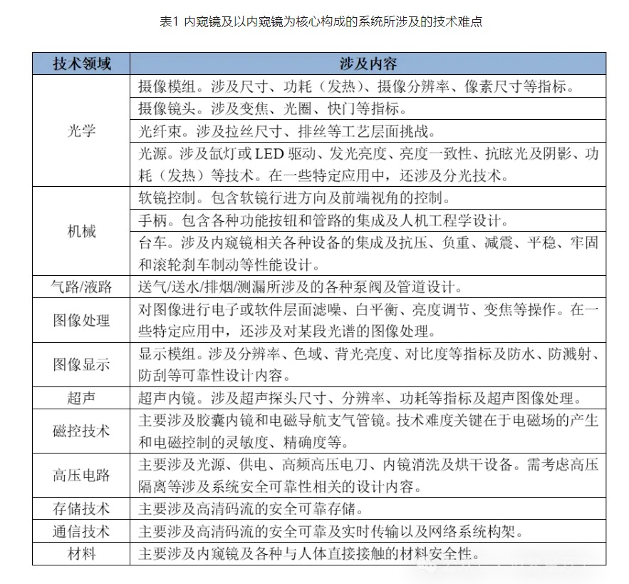 以上我们对内窥镜及以内窥镜为核心构成的系统进行了简单的介绍,内窥镜从技术角度来说是一个结合了机械、气路/液路、材料、电子、高压电路、光学、图像处理、人机工程学、通信技术、声学等多学科相结合的精密仪器设计领域,其医疗器械的属性也对其安全可靠性提出了更为苛刻的要求。如表1所示为我们归纳整理的内窥镜及以内窥镜为核心构成的系统所涉及的技术难点: