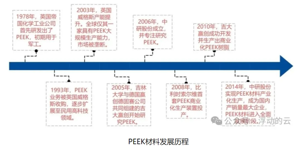 1978年,英国帝国化学工业公司(ICI)首先研发出PEEK材料,凭借优异的综合性能,长期作为战略性国防军工材料;1993年ICI被英国威格斯收购,随后PEEK材料逐步扩展至民用高科技领域;2008年,比利时索尔维投产第一套PEEK商业化生产装置;2010年,德国赢创与吉林大学设立的合资公司吉大赢创成功开发并生产出商业化PEEK树脂,打破威格斯垄断,国内PEEK材料进入商业化阶段;2014年,中研股份实现PEEK材料产业化生产,PEEK材料进入全面发展阶段。