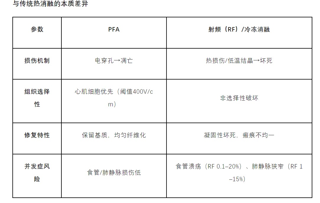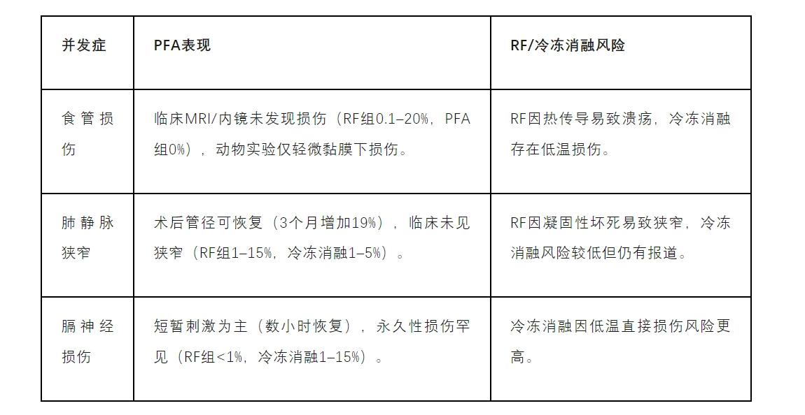 PFA以非热消融机制,在房颤管理中展现与传统技术相当的疗效和更优的安全性,尤其在食管/肺静脉保护方面优势显著。尽管溶血、冠脉痉挛等风险需警惕,但其整体并发症率低于RF和冷冻消融。未来纳秒脉冲、智能导管等技术迭代将推动PFA向心室消融等复杂场景拓展。