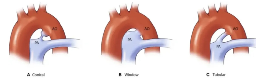 窗型:最少见,降主动脉与主肺动脉紧贴呈窗式;