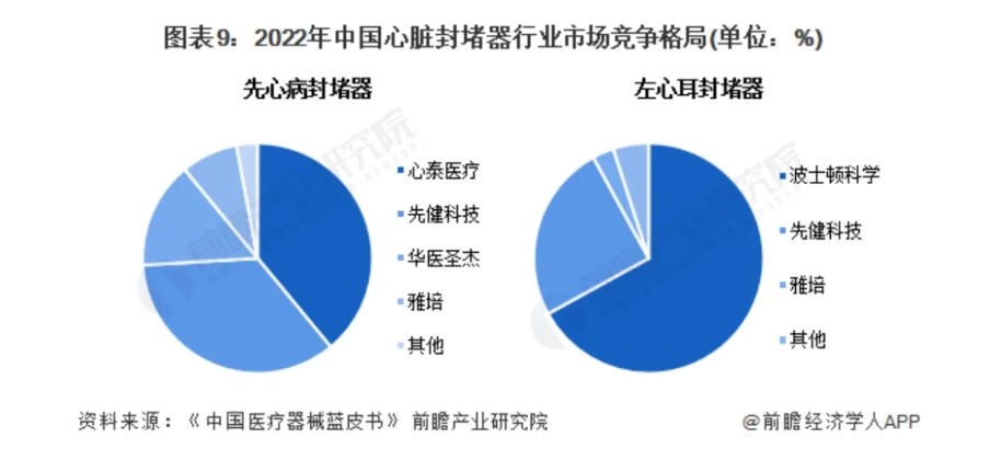 国内先天性心脏病封堵器市场高度集中,呈现三足鼎立局面,心泰医疗、先健科技、华医圣杰占据约90%的市场份额;在心源性卒中封堵器市场,进口企业占据主要市场份额,在左心耳封堵器领域,进口品牌波士顿科学占据67%的市场份额,国产品牌先健科技占据25%的市场份额。
