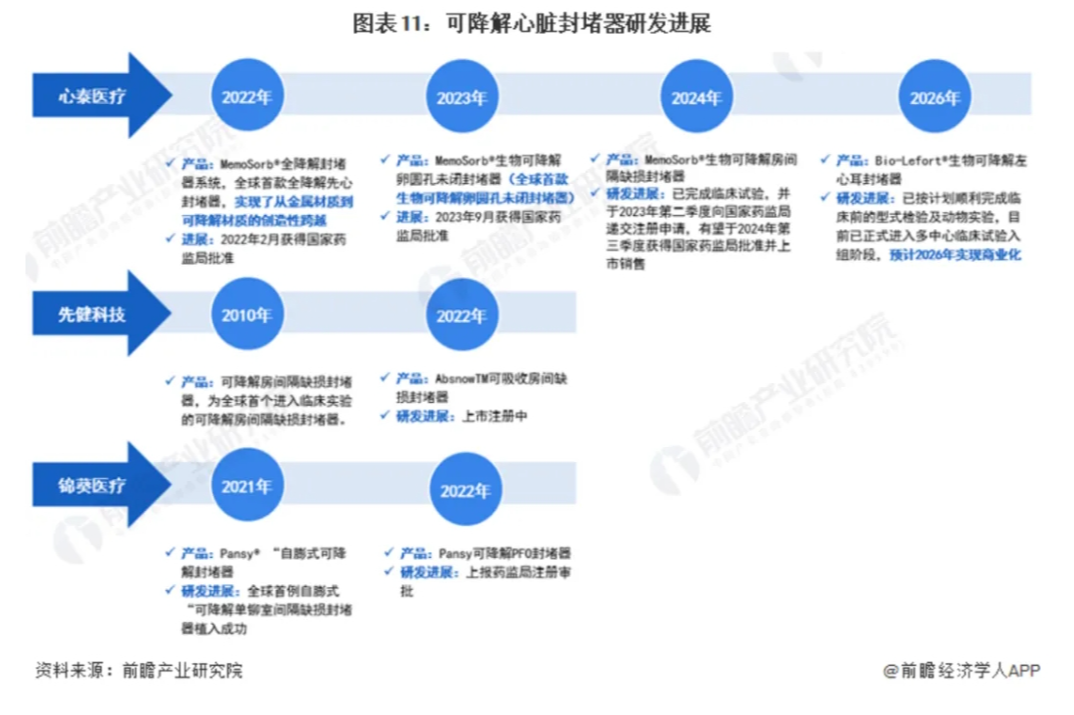 从企业研发进展来看,目前,乐普医疗、先健科技、锦葵医疗均已研发可降解封堵器。