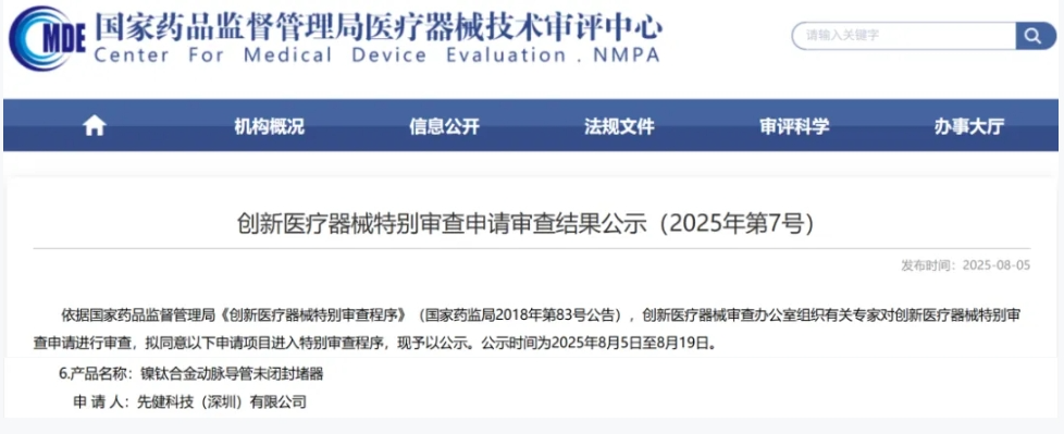 其中包括先健科技(深圳)有限公司(简称“先健科技”)申请的镍钛合金动脉导管未闭封堵器。