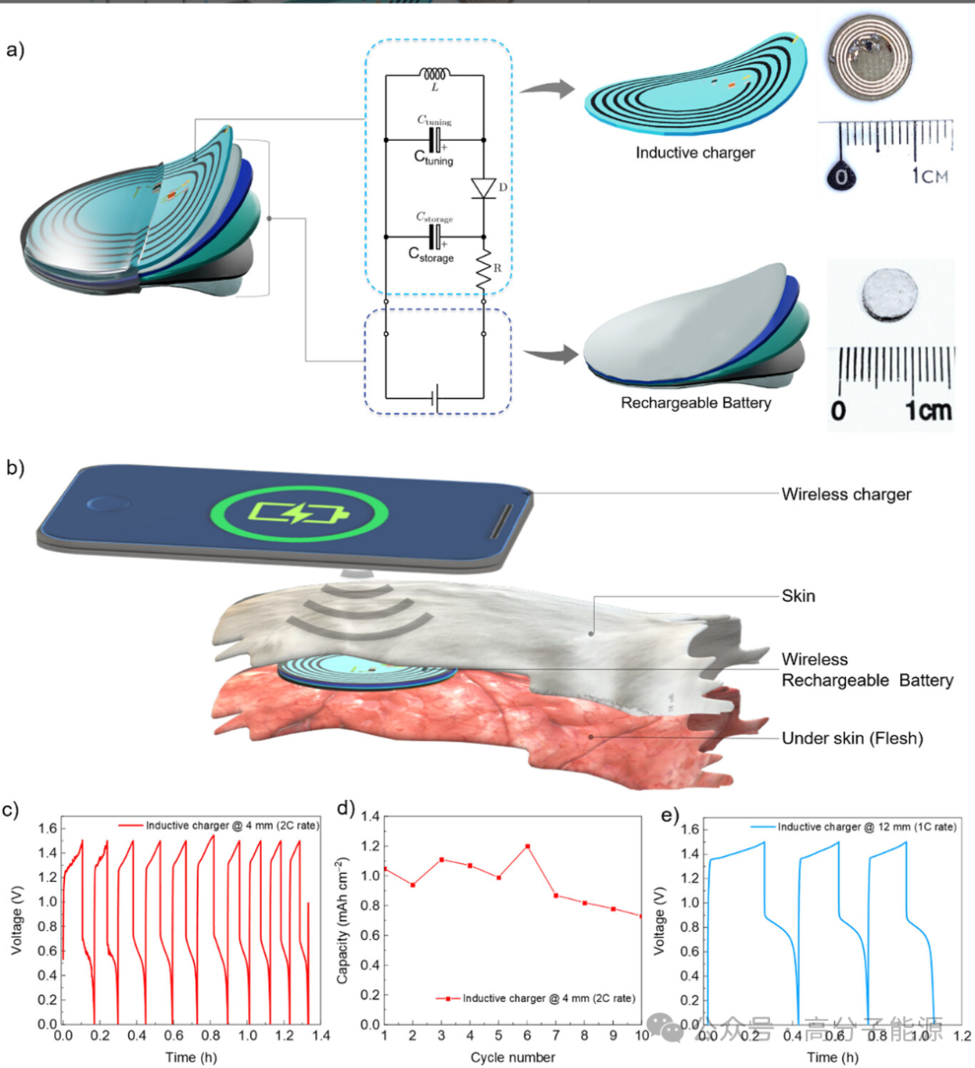 用于临时医疗设备(TMDs)的植入式全固态可生物消解电池的示意图。该设计理念基于一个可生物吸收的钠离子电池与一个感应充电器相连接,以实现无线充电。此外,还使用了一种可溶解的聚合物涂层来控制植入系统的使用寿命。