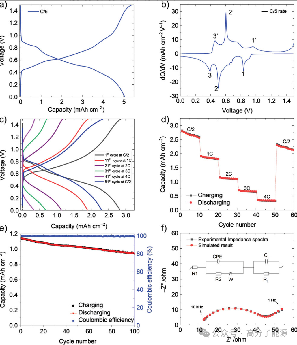 电池性能优异:该电池首次放电容量达 5.1 mAh cm⁻² ,能在不同倍率下充放电,最高可达 4C(15 分钟完成充放电),在 2C 倍率下循环 100 次后容量保持率为 83%,库仑效率稳定在 98%,内部电阻低,展现出良好的电化学性能。
