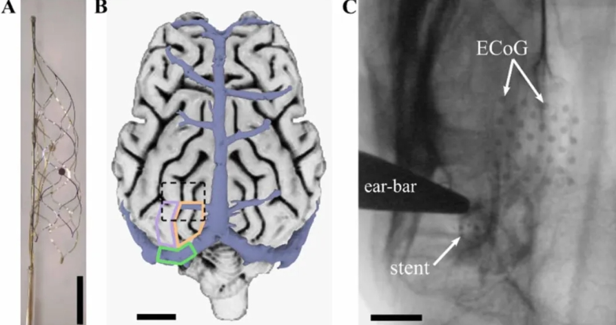 通过颈部静脉穿刺,将直径仅2-3毫米的电极支架(如镍钛合金或聚酰亚胺材料)经血管推送至大脑运动皮层附近的静脉窦(如上矢状窦)。例如,南开大学段峰团队开发的仿生蛛网状电极支架,可自适应血管搏动并保持信号稳定,其电极密度达每平方厘米32个触点,分辨率接近传统侵入式电极。复旦大学附属中山医院与中科院脑科学与智能技术卓越创新中心合作研发的超柔性电极阵列(uFINE-I)更突破技术瓶颈,通过轻微穿透血管壁实现单神经元级别的尖峰放电记录,信噪比提升至传统方法的3倍以上。